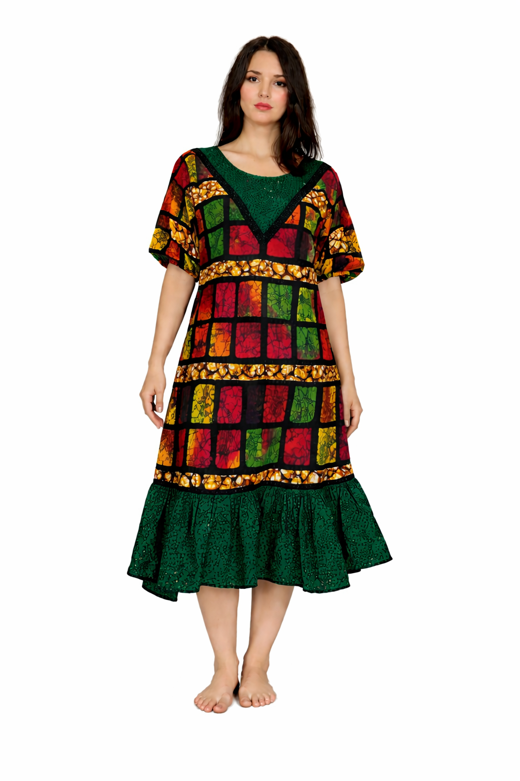 A vibrant African print knee-length dress featuring bold patchwork panels, a flattering V-neckline, and a soft ruffled hem for added movement and style.